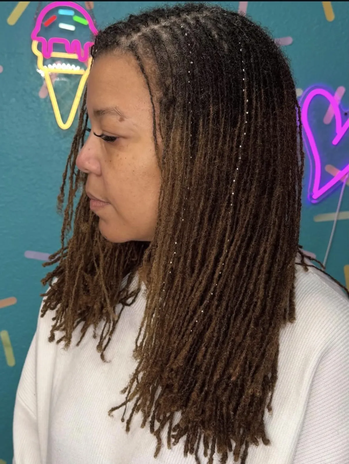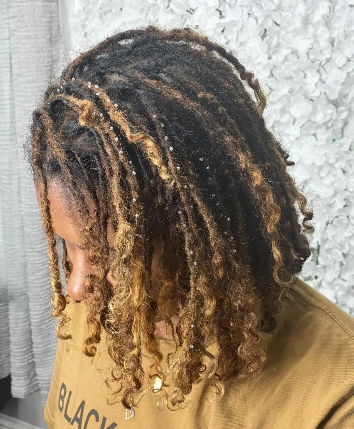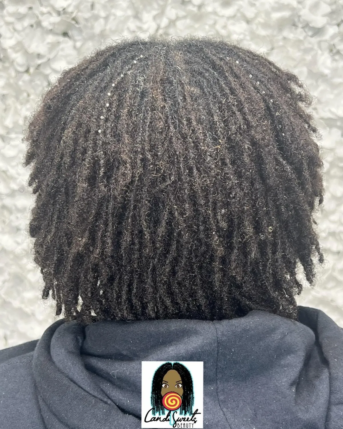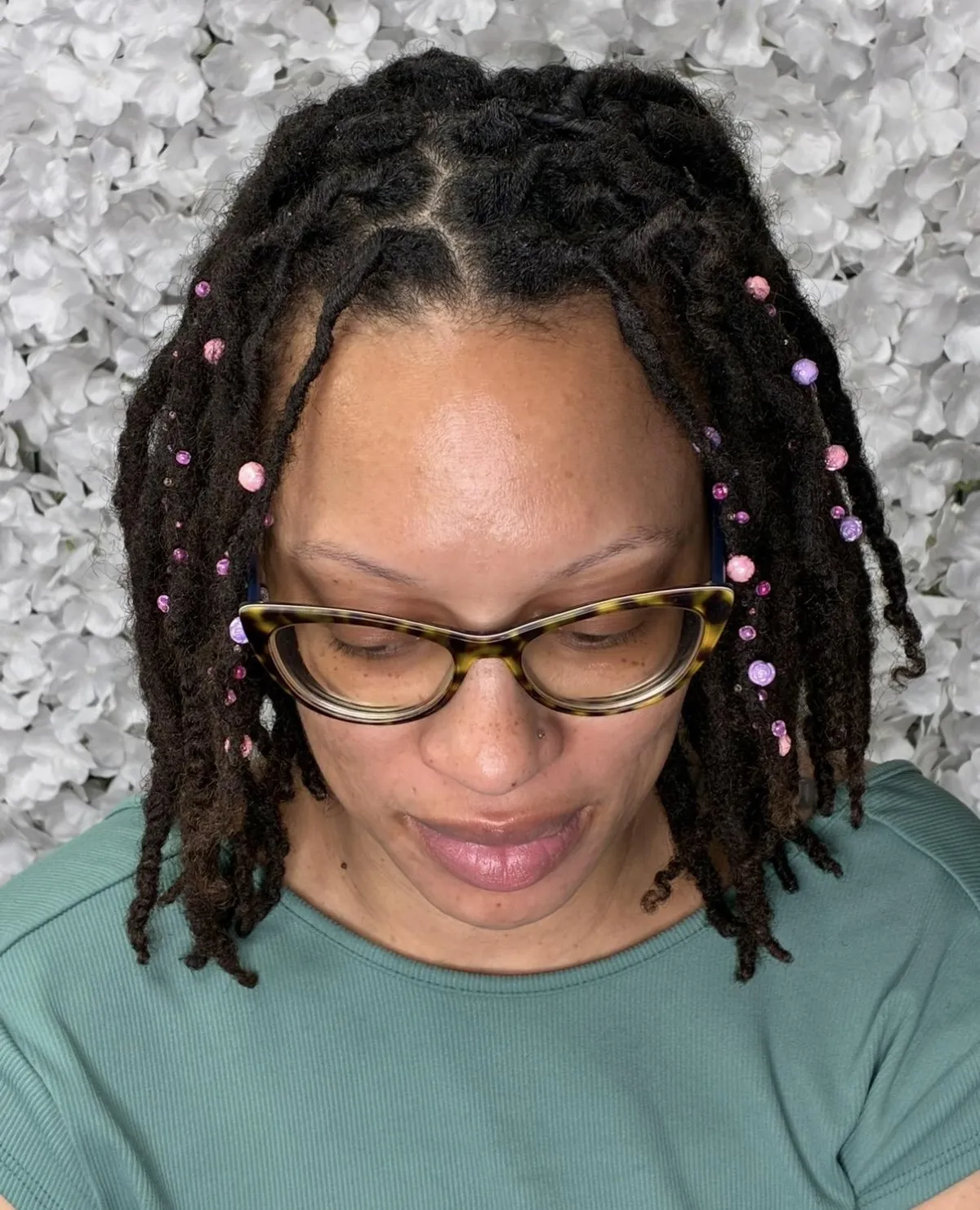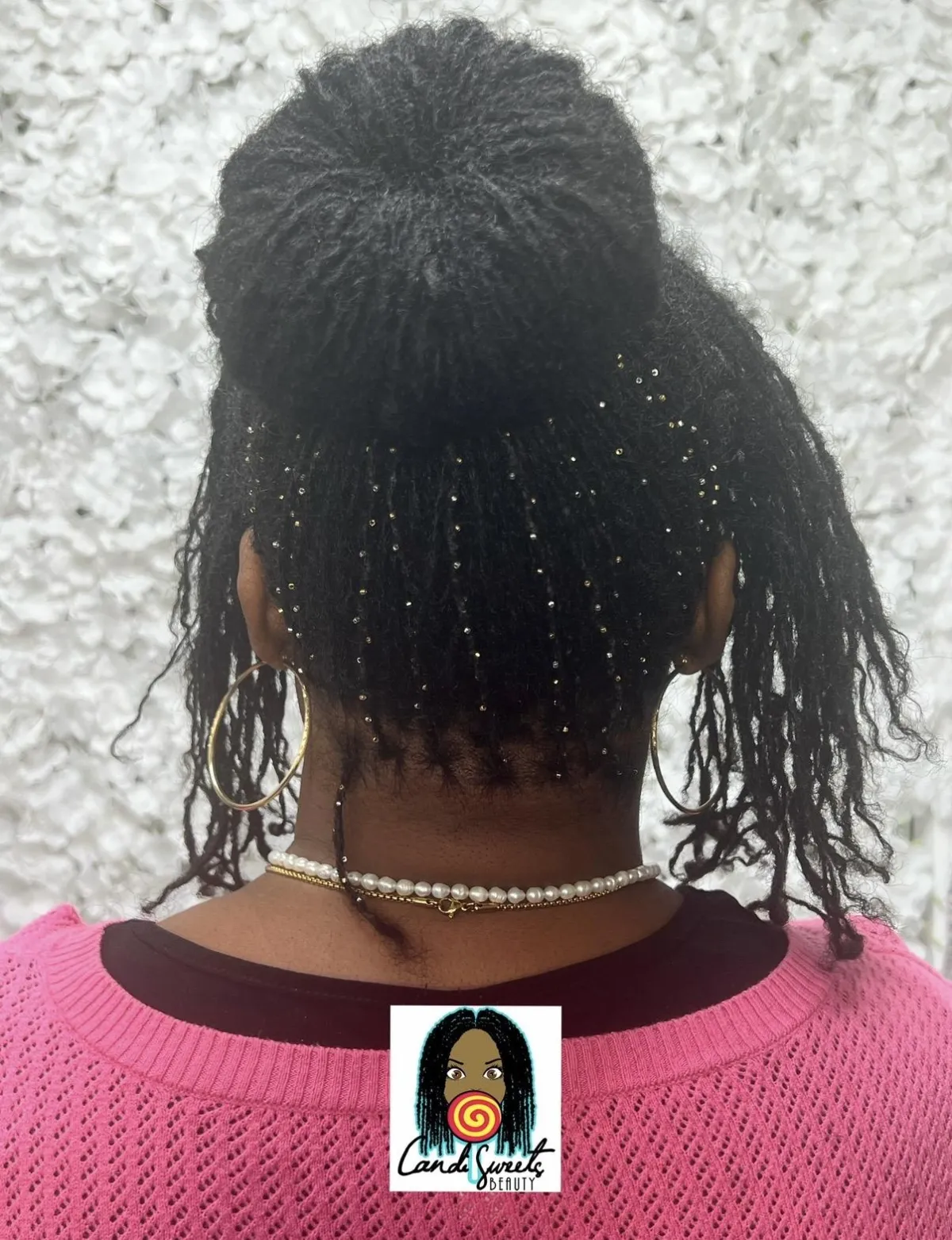 Hair sprinkles are lightweight, decorative accents added to your locks or braids to enhance your look. They are professionally installed by a loctician to ensure they are secure, evenly placed, and styled to complement your overall look based on your desired color and finish.