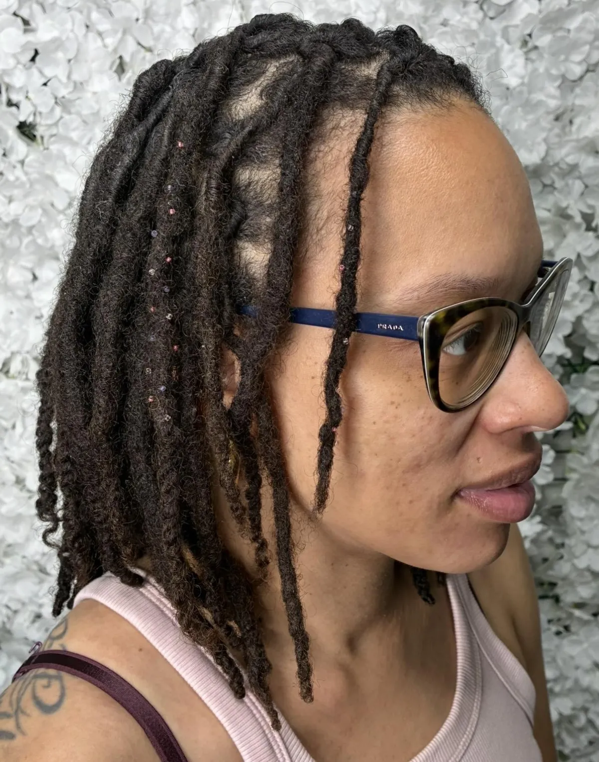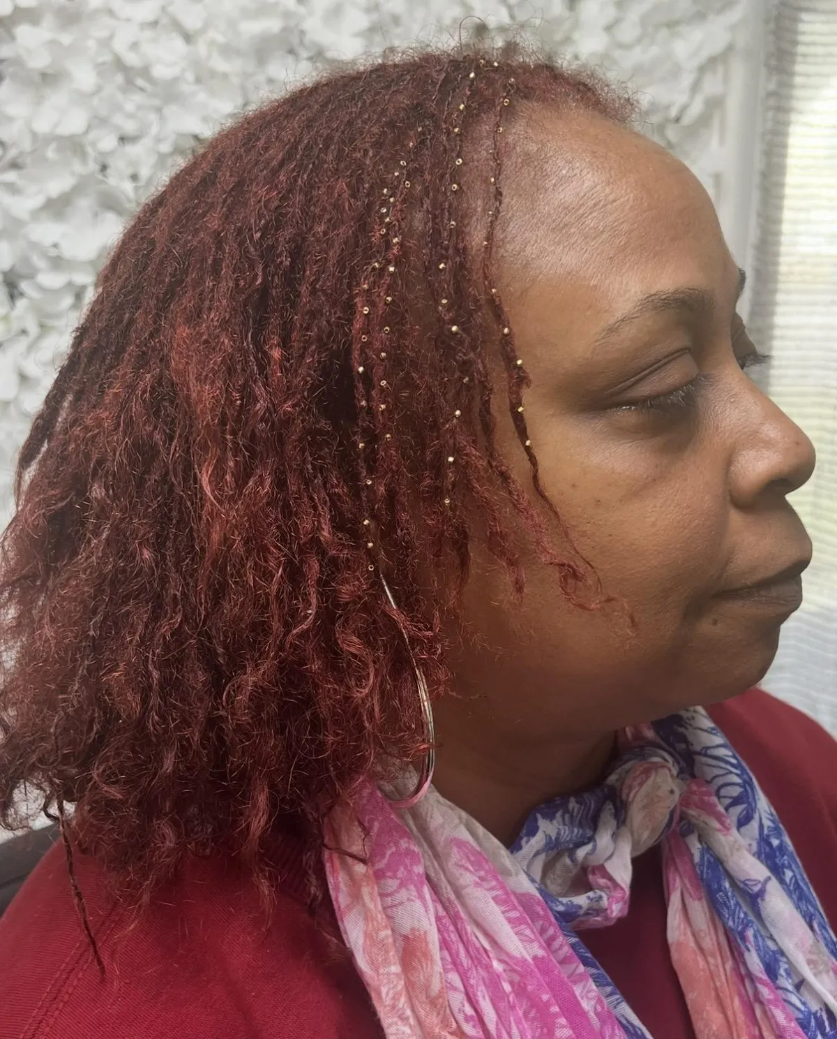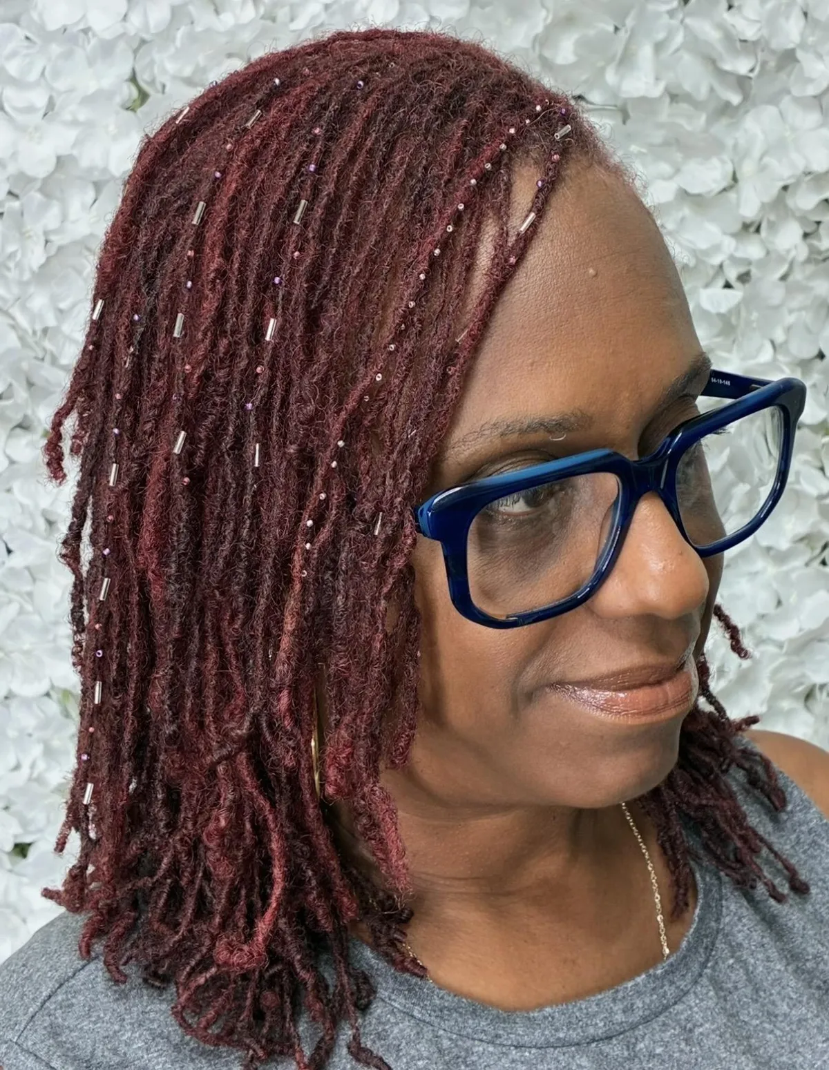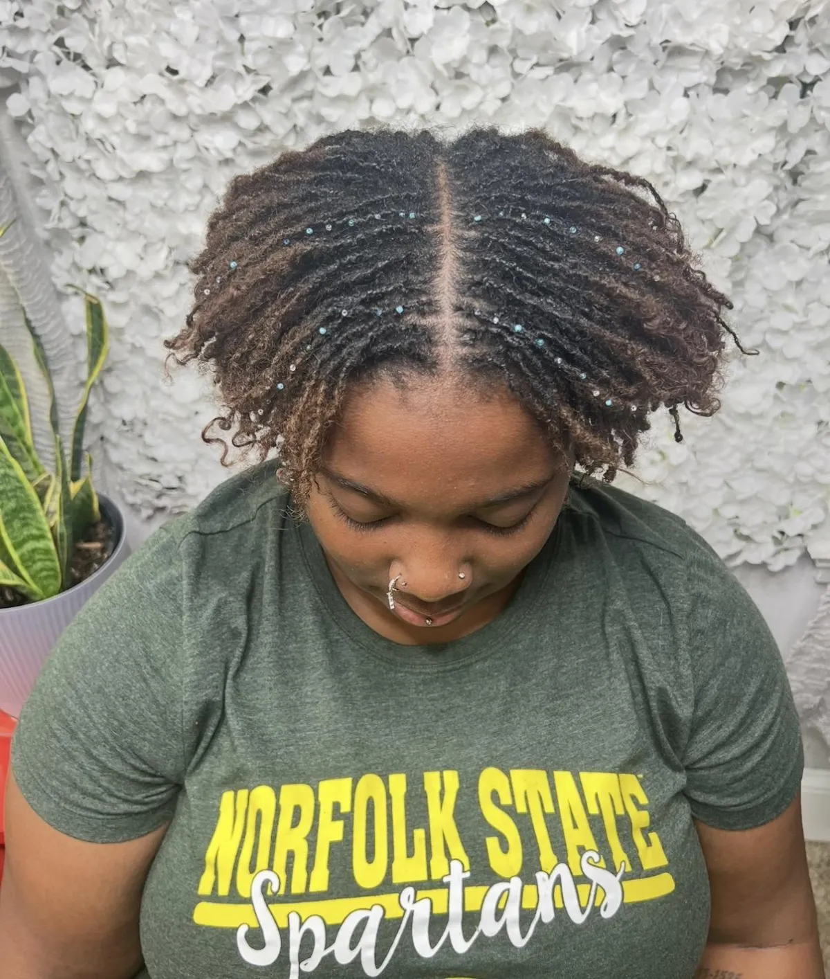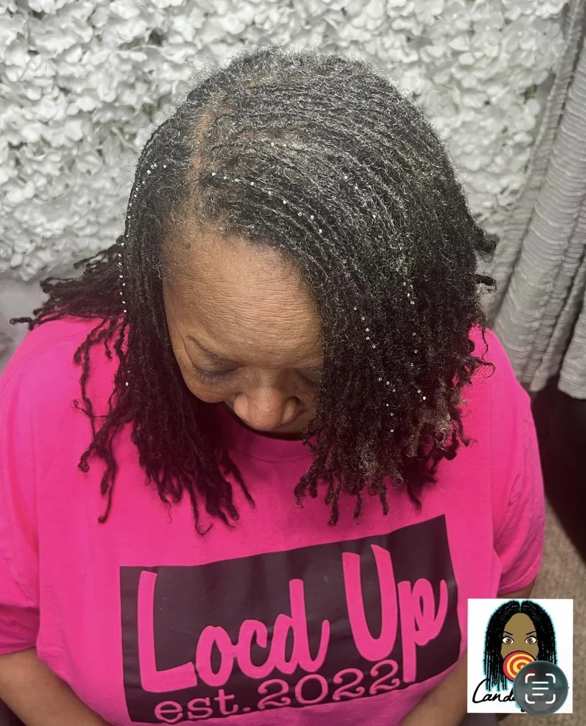 Hair sprinkles are lightweight, decorative accents added to your locks or braids to enhance your look. They are professionally installed by a loctician to ensure they are secure, evenly placed, and styled to complement your overall look based on your desired color and finish.